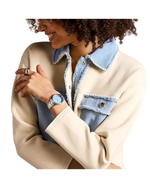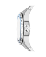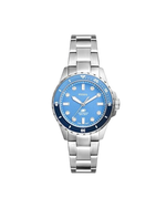 36mm case, 18mm band width, mineral crystal, Quartz movement with 3-hand analog display, imported. Round stainless steel case, with a blue dial. Silver, stainless steel bracelet. Water resistant up to 100m: Can be worn bathing,...